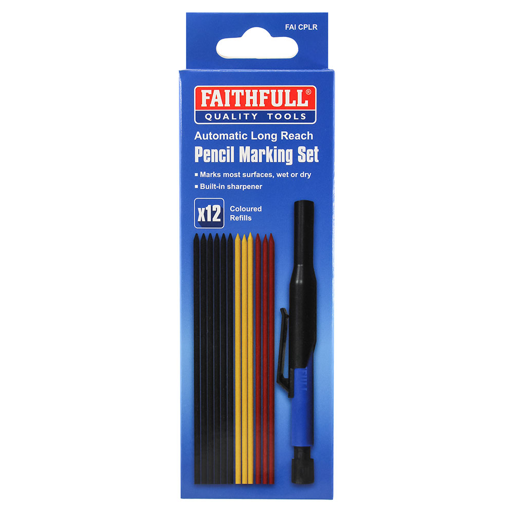 The Faithfull Pencil Marking Set is designed to aid in the marking of hard to reach places such as drilled holes, tight corners and piping. The set includes twelve spare lead pencil refills (six black, three red, three yellow) and a pen holder which can be clipped to a belt or pocket. Each pencil can be used to easily mark any surface whether it’s wet or dry and if needed the markings can be wiped clean with a damp cloth.