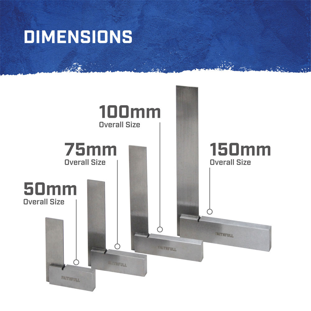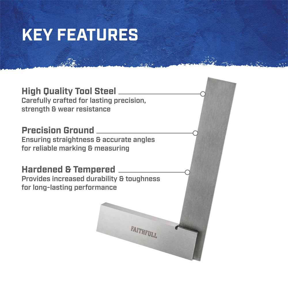 Carefully crafted from high quality tool steel, the Faithfull engineers steel try squares are precision ground to ensure straightness and accuracy, and the spring steel blade is hardened and tempered for increased durability