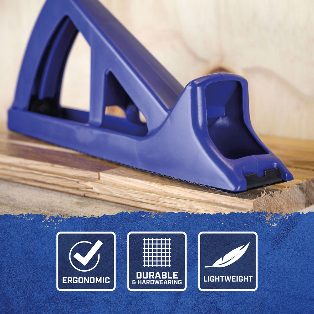 The lightweight and strong ABS plastic body is shaped like a plane to allow single or dual handed operation for fast stock removal.