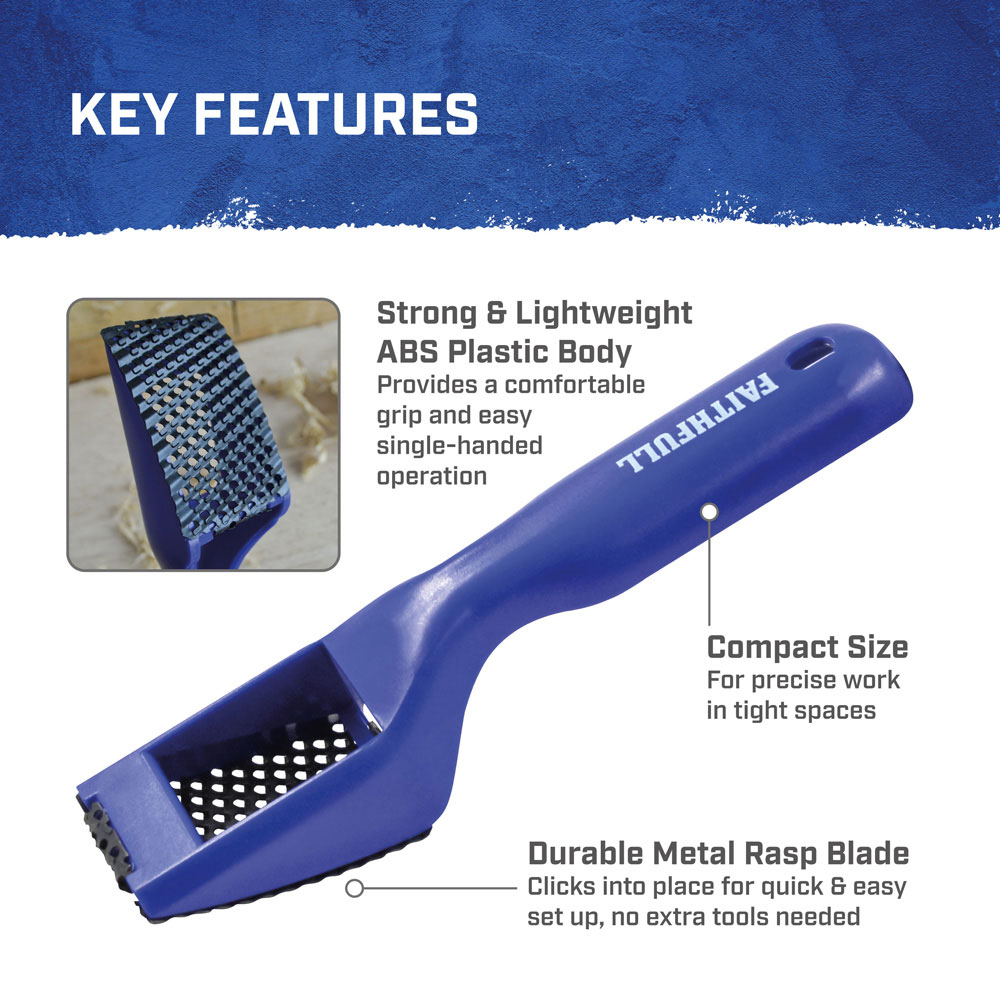 The Faithfull Hand Rasp Shaver Tool is suitable for removing material from all types of wood, aluminium, plastics, fibreglass and laminates. It can also be used for plaster and filler removal.