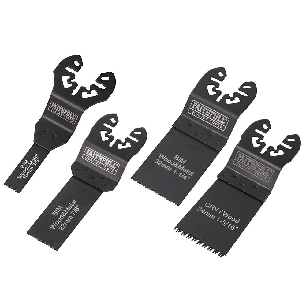 This 8-piece Multi Tool Blade Set includes both BIM and CRV blades, designed for cutting wood, metal, and plastic. It contains a selection of the most popular blades for various applications, including cutting wood, man-made boards, metal, ceramics, stone, removing grout, and scraping. Compatible with many multi-function oscillating power tools.