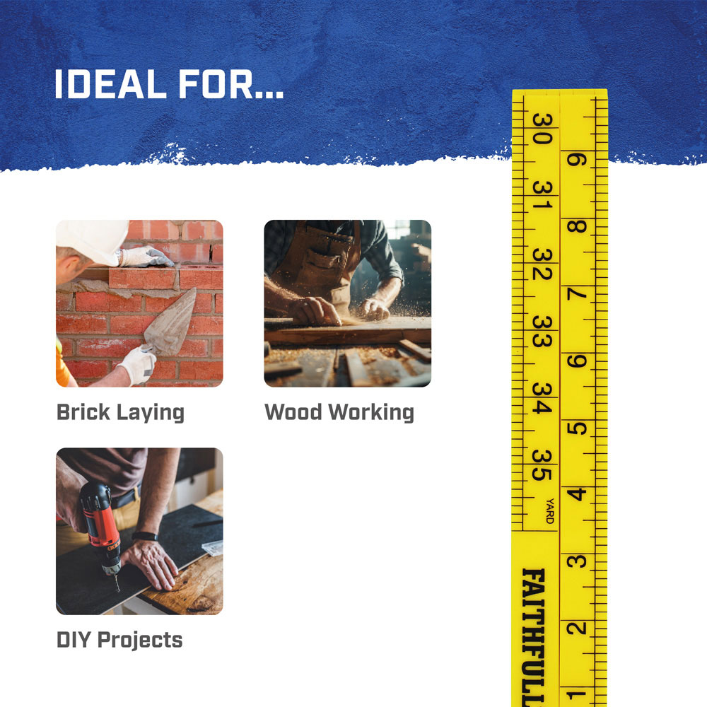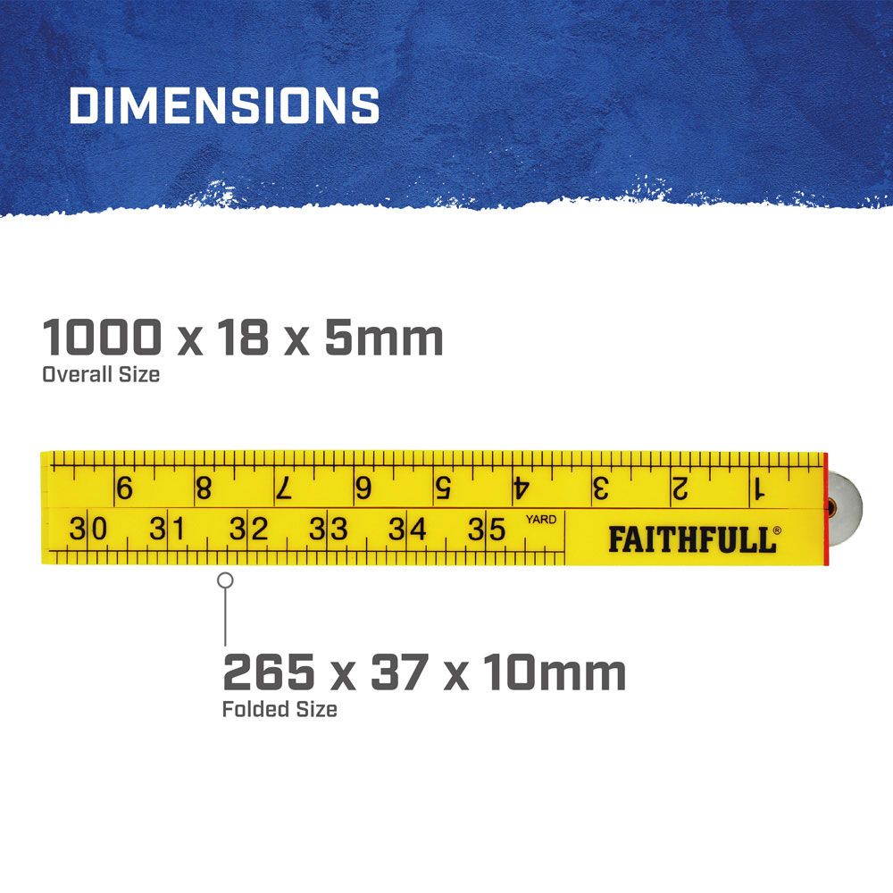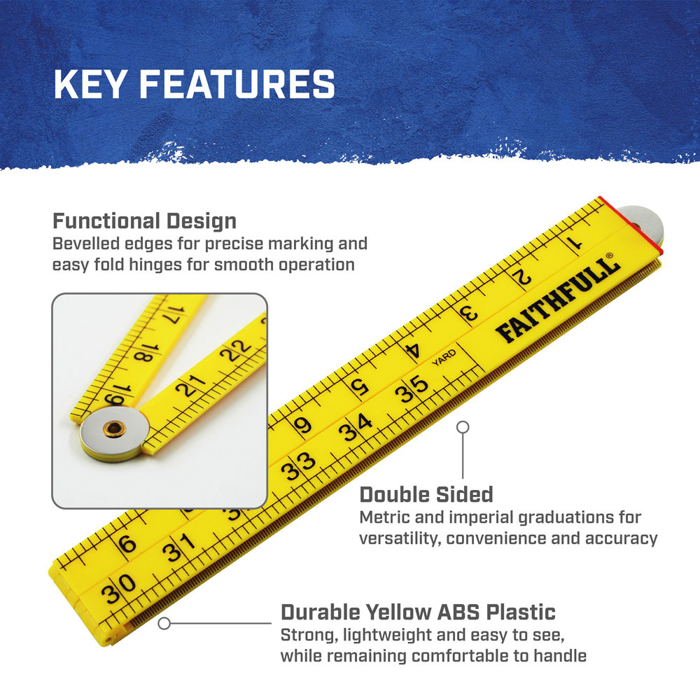 Manufactured from a virtually unbreakable yellow ABS plastic, the rule features bevelled edges and easy folding hinges. The rule displays both metric and imperial graduations for convenience, with the metric scale graduated in 1mm and 5mm intervals, and figured every 10mm up to one metre. The imperial scale is graduated in 8ths and is figured every inch up to one yard (36in).