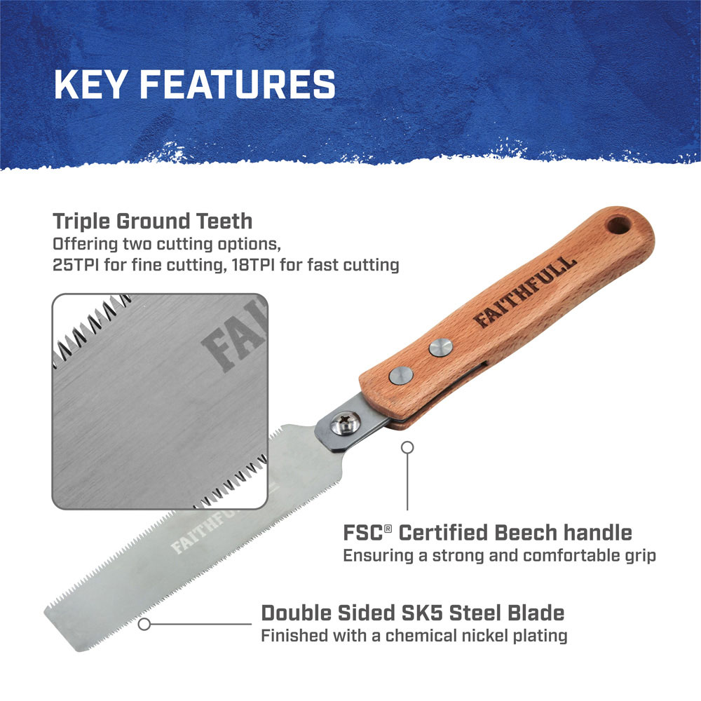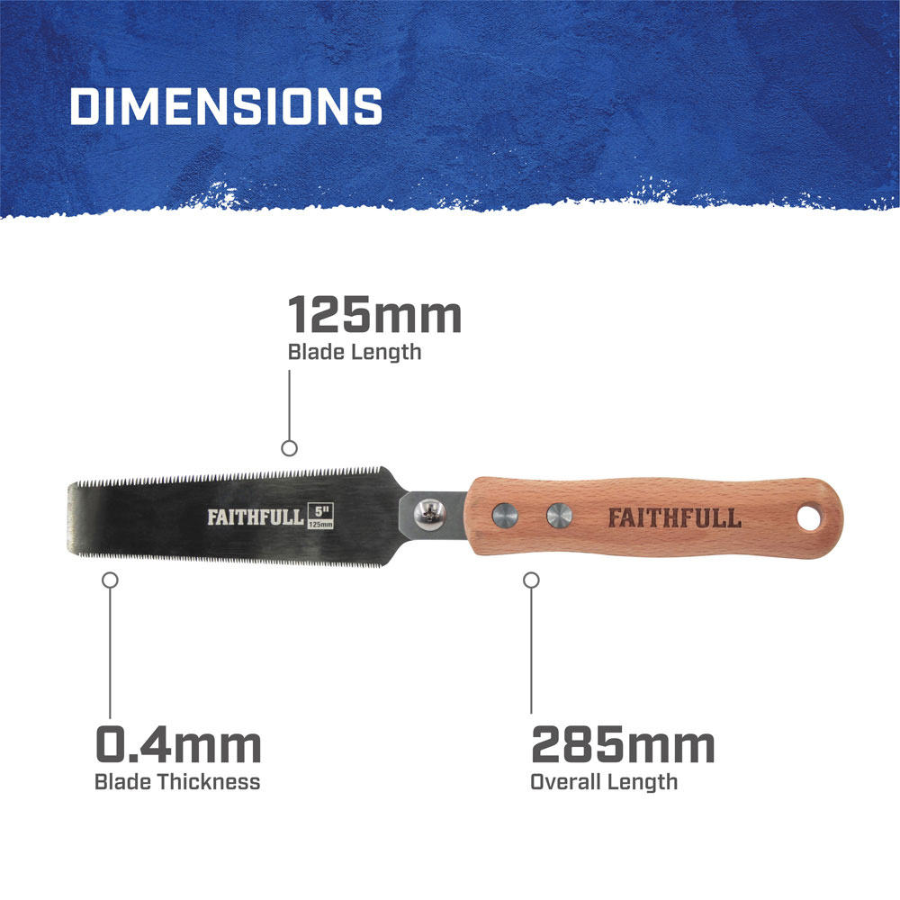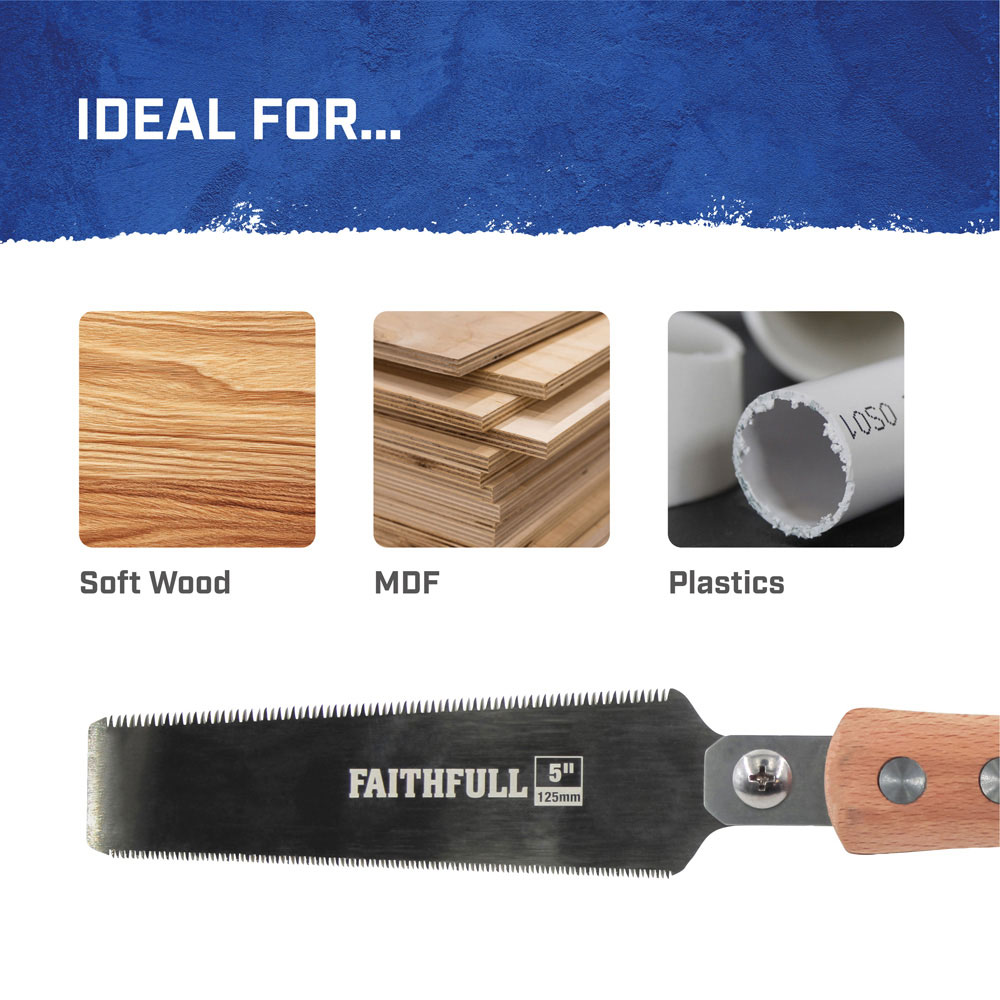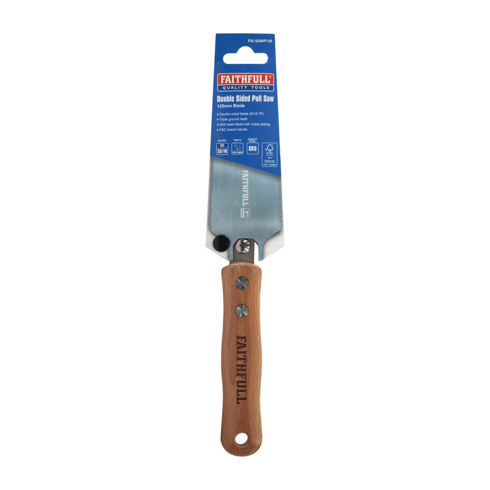 The 125mm Faithfull Pull Saw is an ideal tool for woodworking and precision cutting. The double-sided blade has 25 teeth per-inch on one side and 18 teeth by-inch on the other.