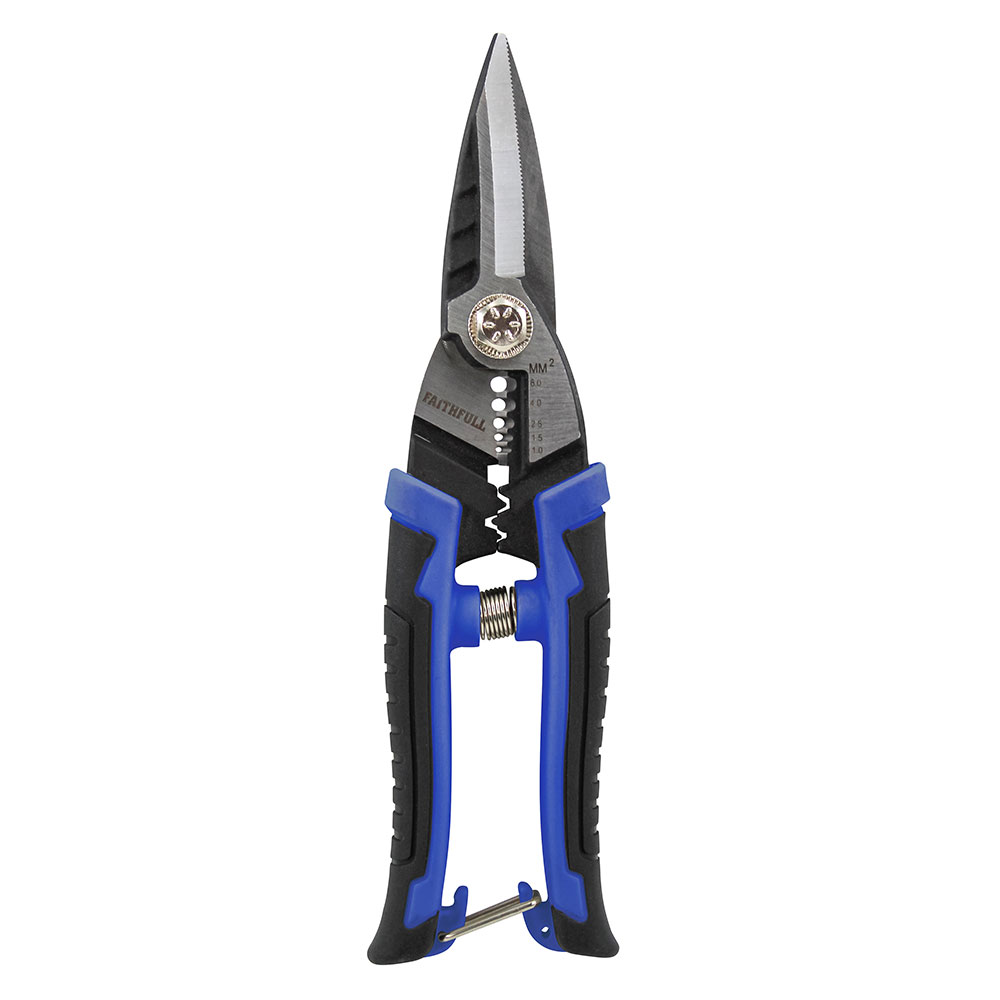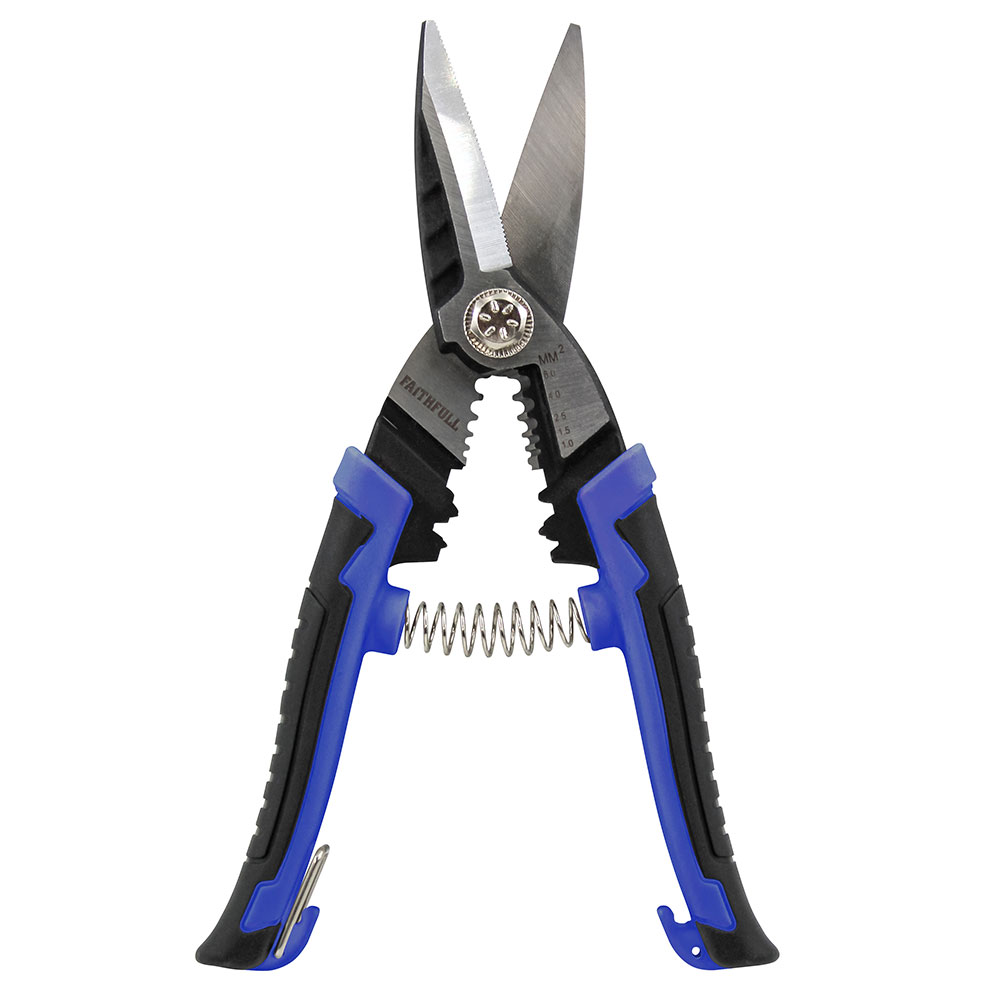 The Faithfull Heavy-duty Multi-function Scissors are ideal for cutting a range of materials from carpet, steel wire, rope, PVC sheets, etc. They are manufactured from heavy-duty carbon 55# steel making them resistant against abrasion and corrosion. The scissors include a wire stripping function which feature the most common sizes and they have the added benefit of a crimping action. The anti-slip handles provide extra grip when in use, whilst the spring action aids the cutting action during prolonged use and finally the handle lock provides extra safety and eases storage.